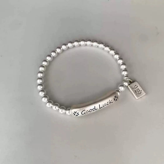 Crafted with elegant silver beads and engraved with the words “Good Luck,” this bracelet serves as your daily charm of optimism — a quiet companion through life’s ups and downs.